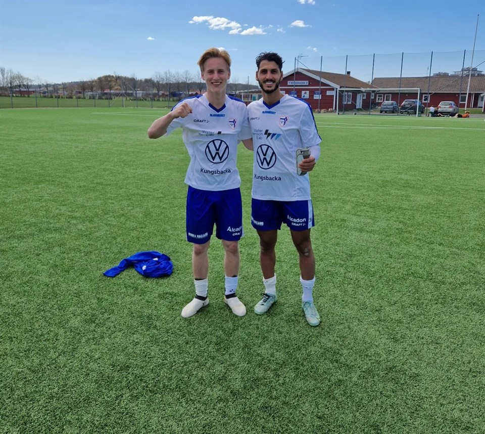 Det blev en lyckad omgång med en stabil seger igår. (2-0 över Böljan, se referat här på sidan) Men nu är det fokus på kommande vecka. Det är dags att gå ut på riktigt fotbollsunderlag (naturgräs) för att ladda upp inför lördagens Derby mot IFK Fjärås, som spelas på Ögärdets naturgräs. Det kommer bli en mycket intressant match där hemmalaget laddat upp ordentligt med mängder av nyförvärv (9st) samt en ny tränare inför denna säsong. Men mer om den matchen något längre fram i veckan. Veckan som kommer ser ut som följande för vår spelartrupp: Måndag: egenträning löpning, styrka Tisdag: gräspremiär Inlag, träning kl 18:00 Torsdag: träning Inlag kl. 18:30 Lördag: A-match, IFK Fjärås, borta, avspark kl. 15:00 Bild: Victor Martinsson & Ali Fayad, direkt efter gårdagens match,
