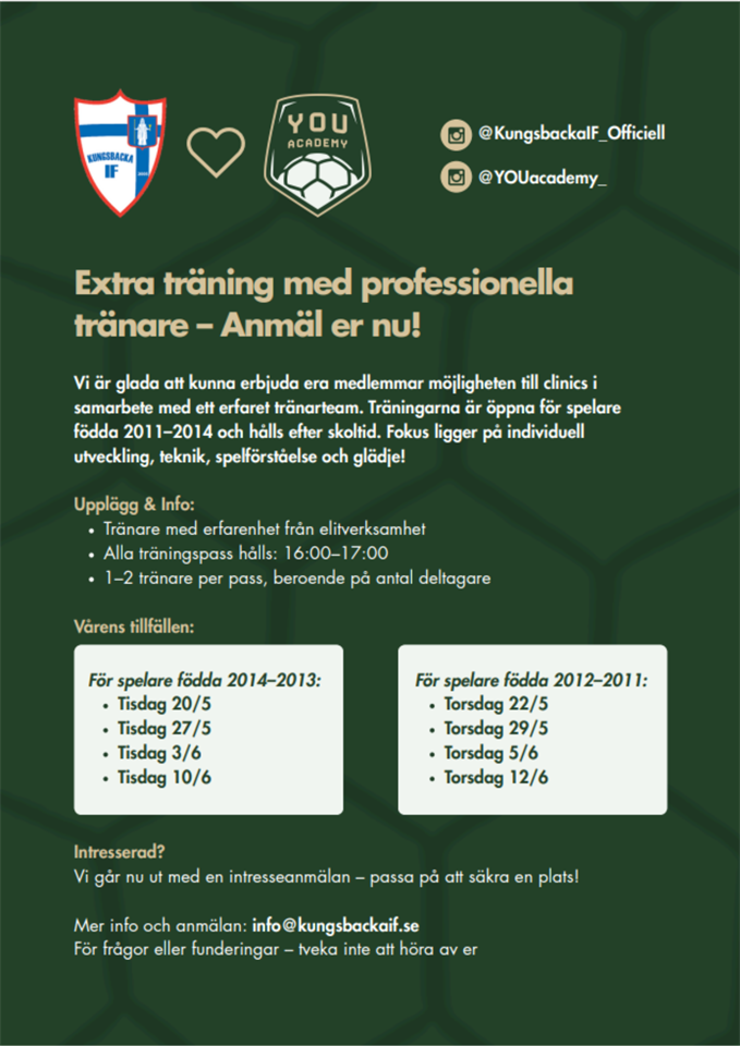 I samarbete med YOU Academy erbjuder nu Kungsbacka IF möjlighet till clinics för spelare födda 2011, 2012, 2013 och 2014. Passen kommer att ledas av professionella tränare med erfarenhet från elitverksamhet där fokus ligger på individuell utveckling, teknik, spelförståelse och glädje! Läs mer och anmäl er HÄR Träningarna vänder sig till spelare med hög ambition och träningsnärvaro i ordinarie lag. Har ni frågor, kontakta kansliet: info@kungsbackaif.se Läs med om YOU Academy HÄR