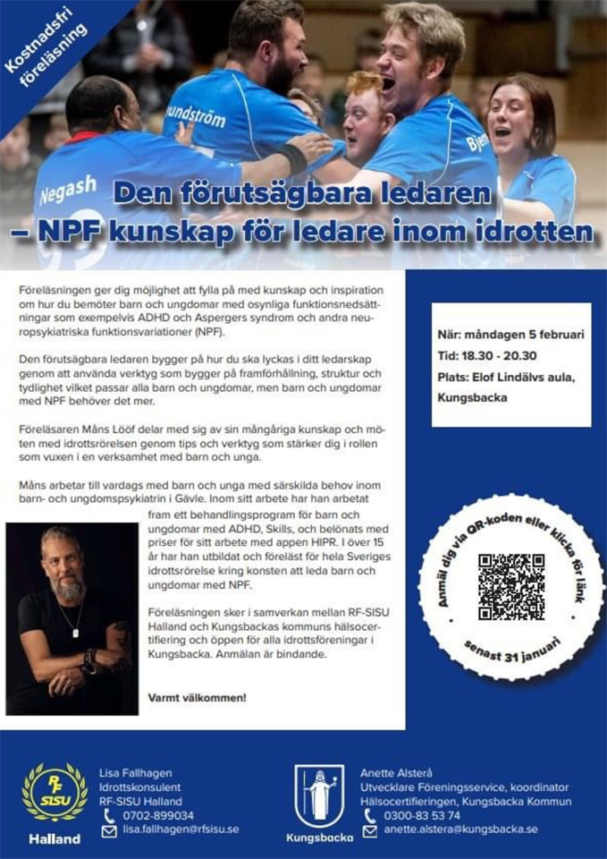 Den förutsägbara ledaren - NPF kunskap för ledare inom idrotten Den förutsägbara ledaren bygger på hur du ska lyckas i ditt ledarskap genom att använda verktyg som bygger på framförhållning, struktur och tydlighet vilket passar alla barn och ungdomar, men barn och ungdomar med NPF behöver det mer. När: Måndag 5 februari Tid: 18:30-20:30 Plats: Elof Lindälvs aula Anmälan senast 31 januari. Föreläsningen är kostnadsfri. TILL ANMÄLAN Ledare 5 dec 2023 0kommentarer
